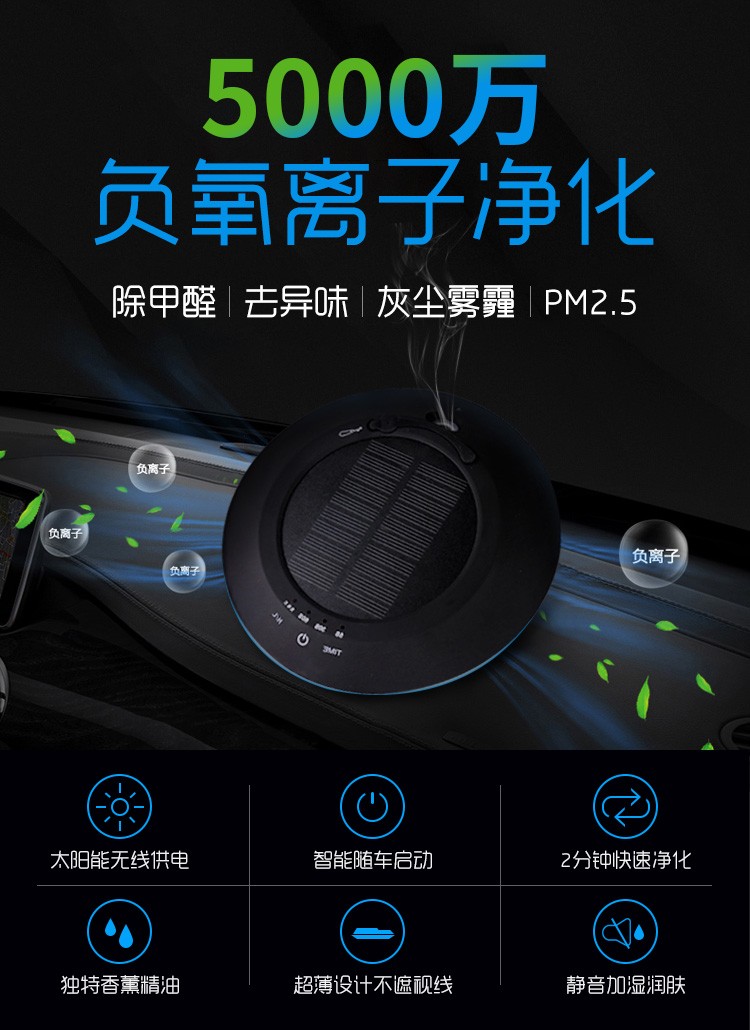 2021新款车载空气清新车内太阳能无线香薰净化器加湿器 汽车用品负离子发生器新车去除异味烟味高效过滤 黑色(智能加湿+祛味除醛+芳香净味)