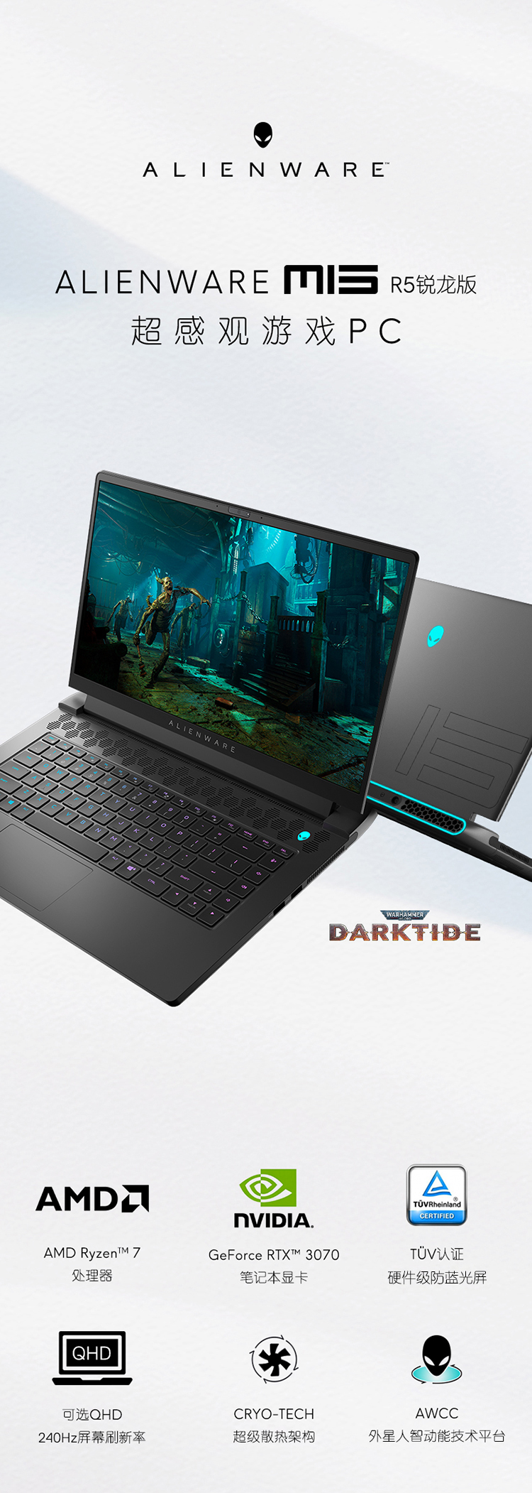 外星人ALIENWARE 21款全新锐龙版m15R5 15.6英寸高端游戏本 8核R7 16G 512GB RTX3050Ti 165Hz高刷屏 1252黑