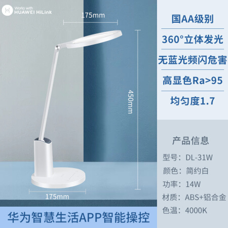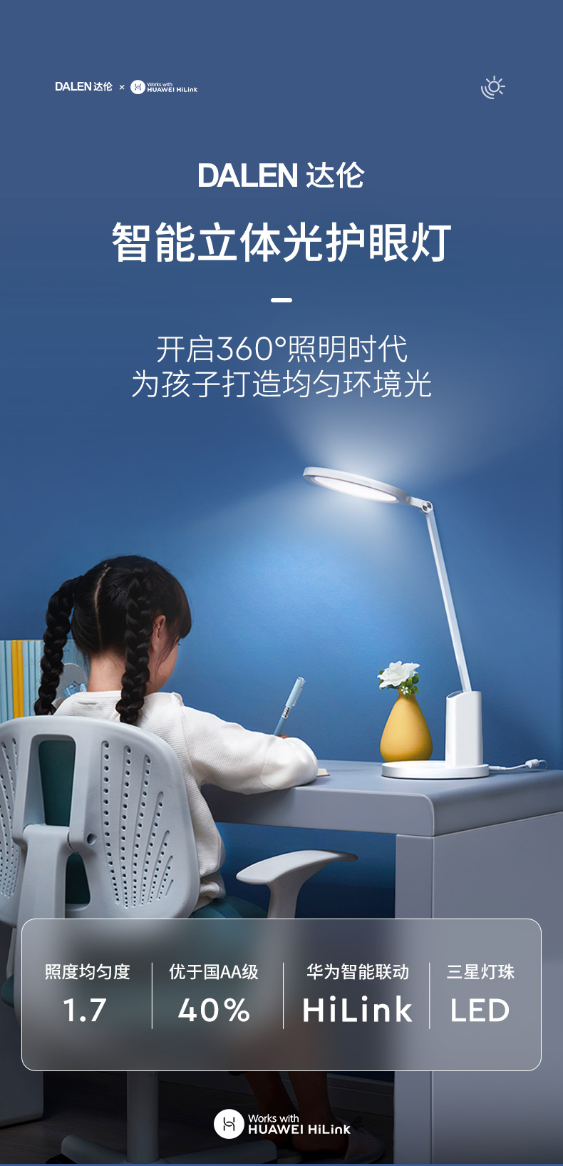 达伦智能护眼台灯国AA级无蓝光危害儿童学生读写台灯学习阅读灯3D立体光 HUAWEI HiLink生态产品 DL-31W