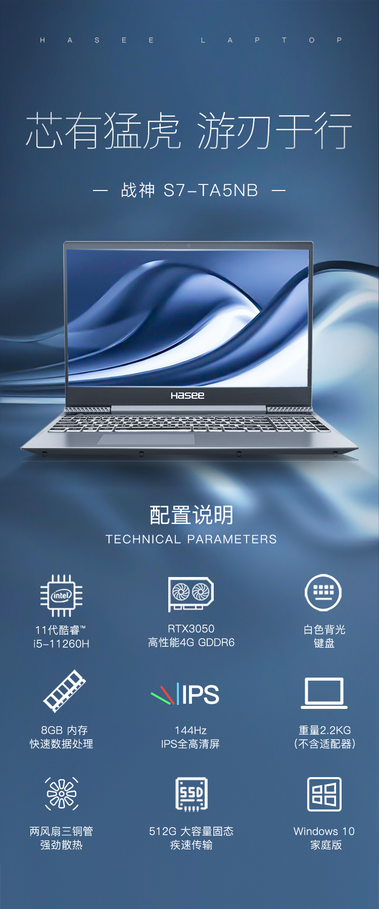 神舟(HASEE)战神S7-TA5NB 15.6英寸游戏笔记本电脑 (新11代酷睿i5-11260H RTX3050 4G 144Hz 8G512GSSD)
